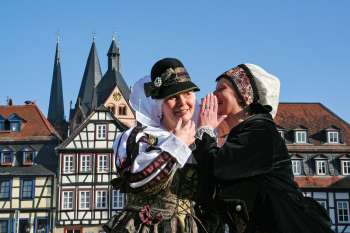 Die beiden Stadtführer Ulrich Lüer und Wolfgang Kamberg schlüpfen in die Rollen der berühmten Sprachforscher und Märchensammler, die 1785 (Jacob) und 1786 (Wilhelm) in Hanau geboren wurden und führen in historischen Kostümen durch die Innenstadt. Quelle: Stadt Hanau / Moritz Göbel