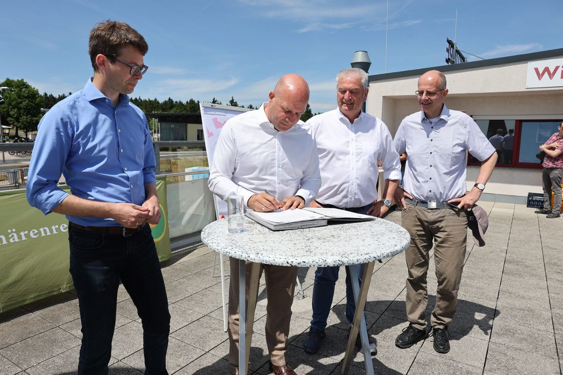 Landtagsabgeordneter Sebastian Müller, Staatsminister Ingmar Jung, Landrat Bernd Woide und der Parlamentarische Staatssekretär im Bundesbildungsministerium Michael Brand bei/nach der Unterzeichnung der Absichtserklärung. Copyright: HMLU