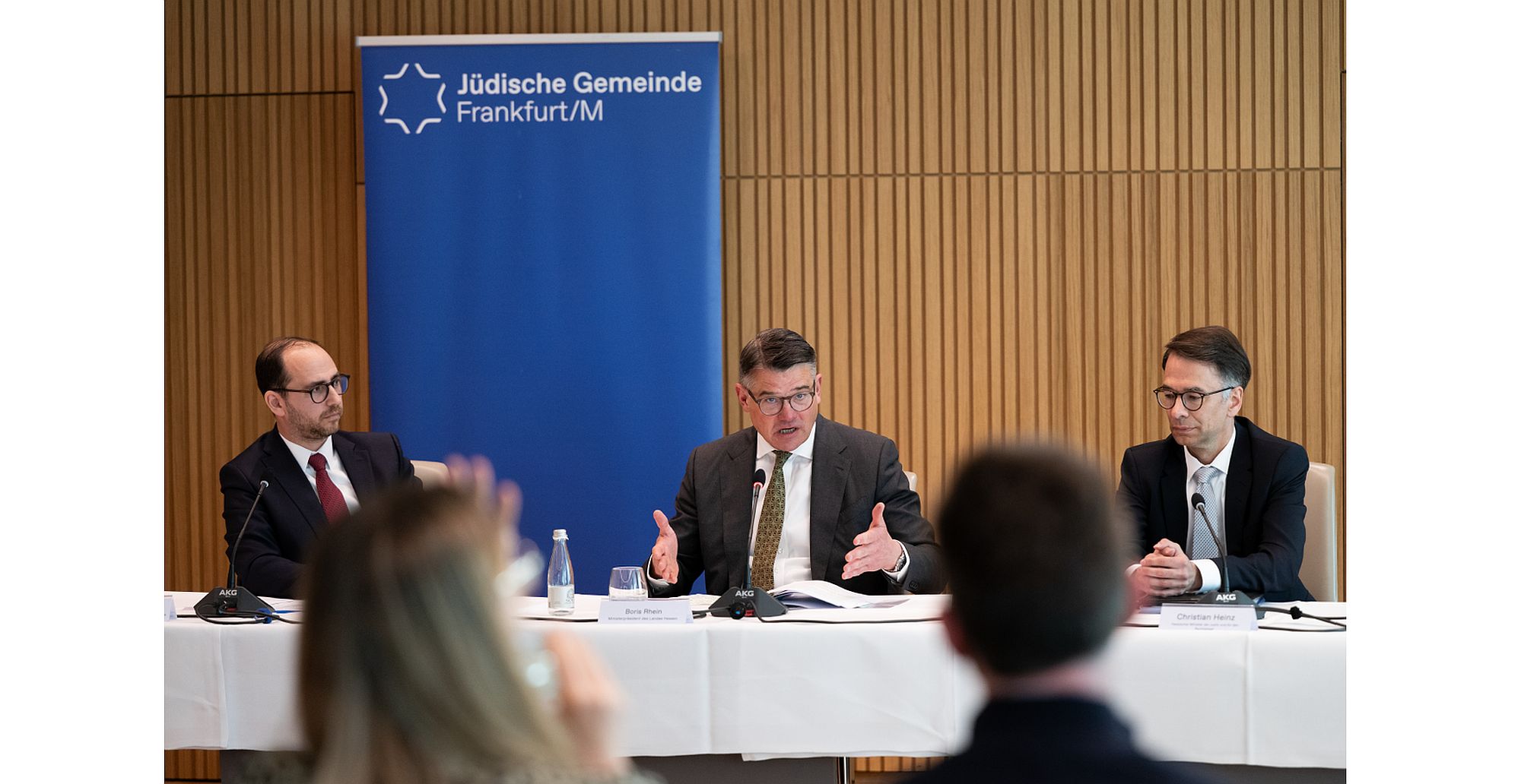 Der Hessische Ministerpräsident Boris Rhein und Justizminister Christian Heinz haben in der Jüdischen Gemeinde in Frankfurt einen neuen Gesetzentwurf vorgestellt, wonach die Leugnung des Existenzrechts Israels unter Strafe gestellt werden soll. BILDQUELLE: Wiegand / Hessisches Ministerium der Justiz und für den Rechtsstaat