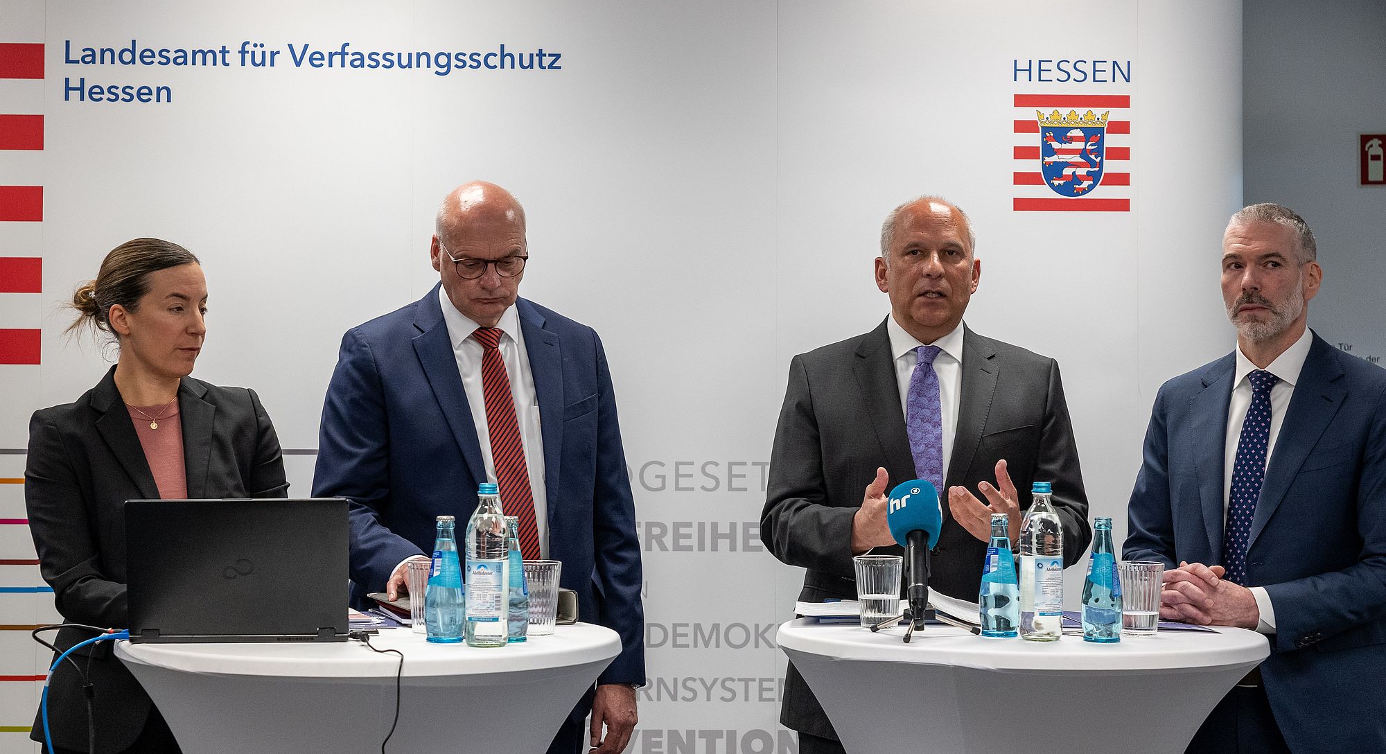 Innenminister Roman Poseck (CDU), Bernd Neumann, Präsident des Hessischen Landesamtes für Verfassungsschutz, Anika Schleinzer, Leiterin der Phänomenbereichsübergreifenden wissenschaftlichen Analysestelle Antisemitismus und Fremdenfeindlichkeit (PAAF) und Daniel Neumann, Vorsitzender des Landesverbandes der Jüdischen Gemeinden in Hessen, haben eine aktuelle Studie des Landesamtes für Verfassungsschutz Hessen vorgestellt, die die Verbreitung antisemitischer Narrative im hessischen Protestgeschehen nach dem 7. Oktober 2023 analysiert.