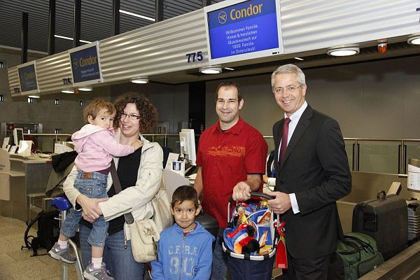 Vom Flughafenchef per Handschlag begrüßt worden sind auf dem Weg in den Osterurlaub Susanne und Andreas Hinkel aus Friedberg: Zusammen mit ihren zwei und fünf Jahre alten Kindern waren sie die tausendste Familie, die vom Frankfurter Flughafen aus in die Osterferien startete.
