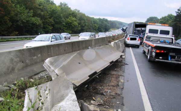 Fahrbahn ins Schleudern kam. Als der Fahrer dann versuchte, den Laster unter Kontrolle zu bringen, geriet er auf die linke Fahrspur und streifte den PKW eines 38 - Jährigen aus Weiterstadt. Der LKW drückte den PKW des 38-Jährigen anschließend gegen die mittig befindliche Betonleitwand. Danach prallte der LKW ebenfalls gegen die Betonwand. Dadurch lösten sich Betonteile und fielen auf die Gegenfahrbahn. Die umherfliegenden Betonteile beschädigten drei Fahrzeuge, die auf der Gegenfahrbahn in Richtung Frankfurt unterwegs waren. Der Laster wurde nach dem Aufprall auf die Betonwand geschoben und kam mit dem Führerhaus darauf zum Stehen. Der 38 - Jährige Autofahrer wurde mit leichten Verletzungen in eine Klinik gebracht. Der gesamte Schaden liegt bei etwa 60.000 Euro. Sowohl in Richtung Norden als auch in Richtung Süden kam es nach dem Unfall zu kilometerlangen Staus. Während die teilweise gesperrten Fahrspuren für den Stau in Richtung Kassel verantwortlich waren, so verursachten Schaulustige größtenteils den Stau in die entgegengesetzte Richtung. Hinweise bitte an die Polizeiautobahnstation Mittelhessen, Telefon 06033 - 9930.