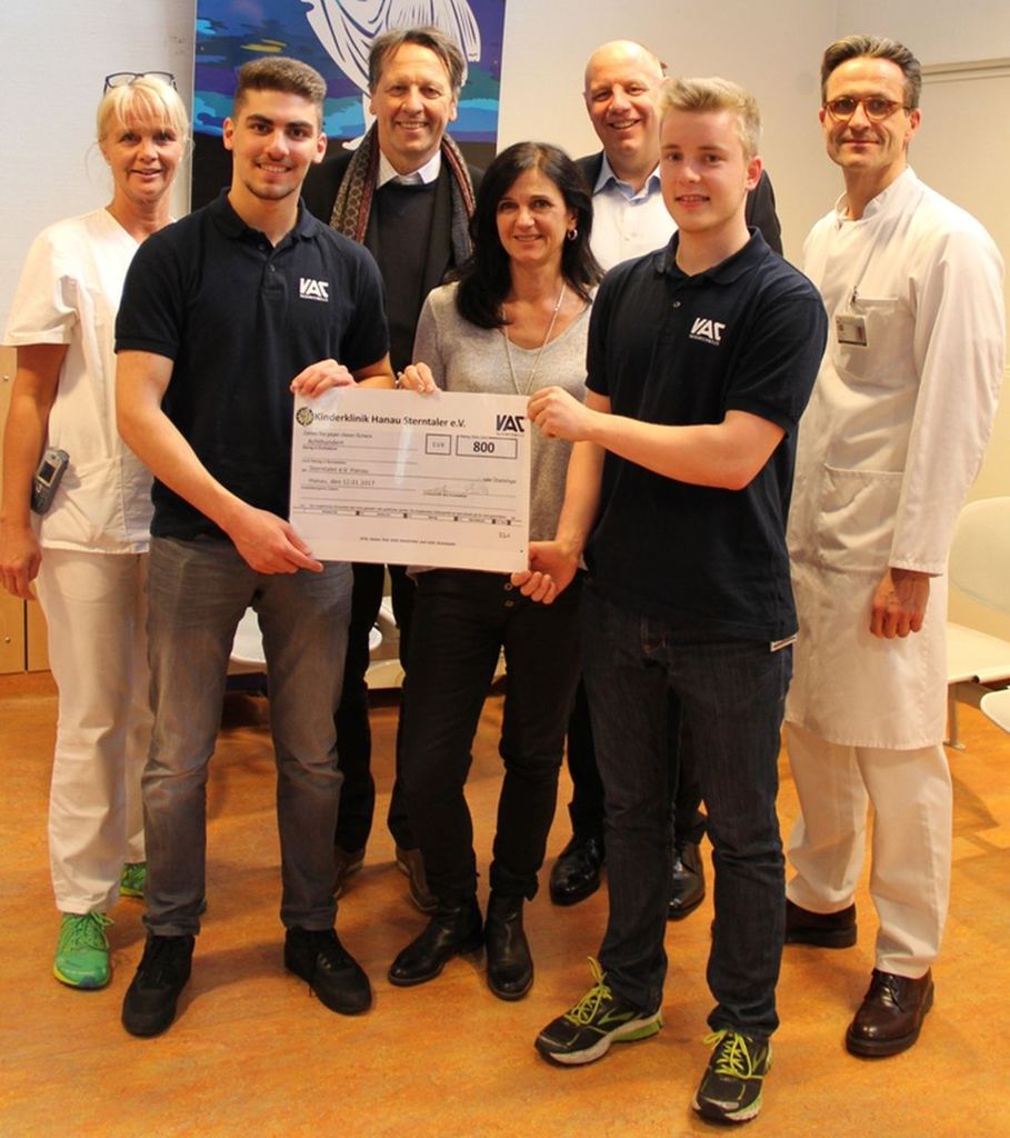 Zusammen mit den beiden Geschäftsführern Dr. Stefaan Florquin und Dr. Erik Eschen, besuchten Philipp Reiter und Selim Bayburt als Stellvertreter der gesamten Ausbildungswerkstatt die Kinderklinik, um ihren Spendenscheck persönlich zu übergeben. „Wir wollen mit dem Geld, das zusammengekommen ist, wieder etwas Gutes tun und eine Spende an den Förderverein Sterntaler hat für uns Azubis bei VAC quasi schon Tradition“, erklärt Selim Bayburt die Entscheidung für den Empfänger.