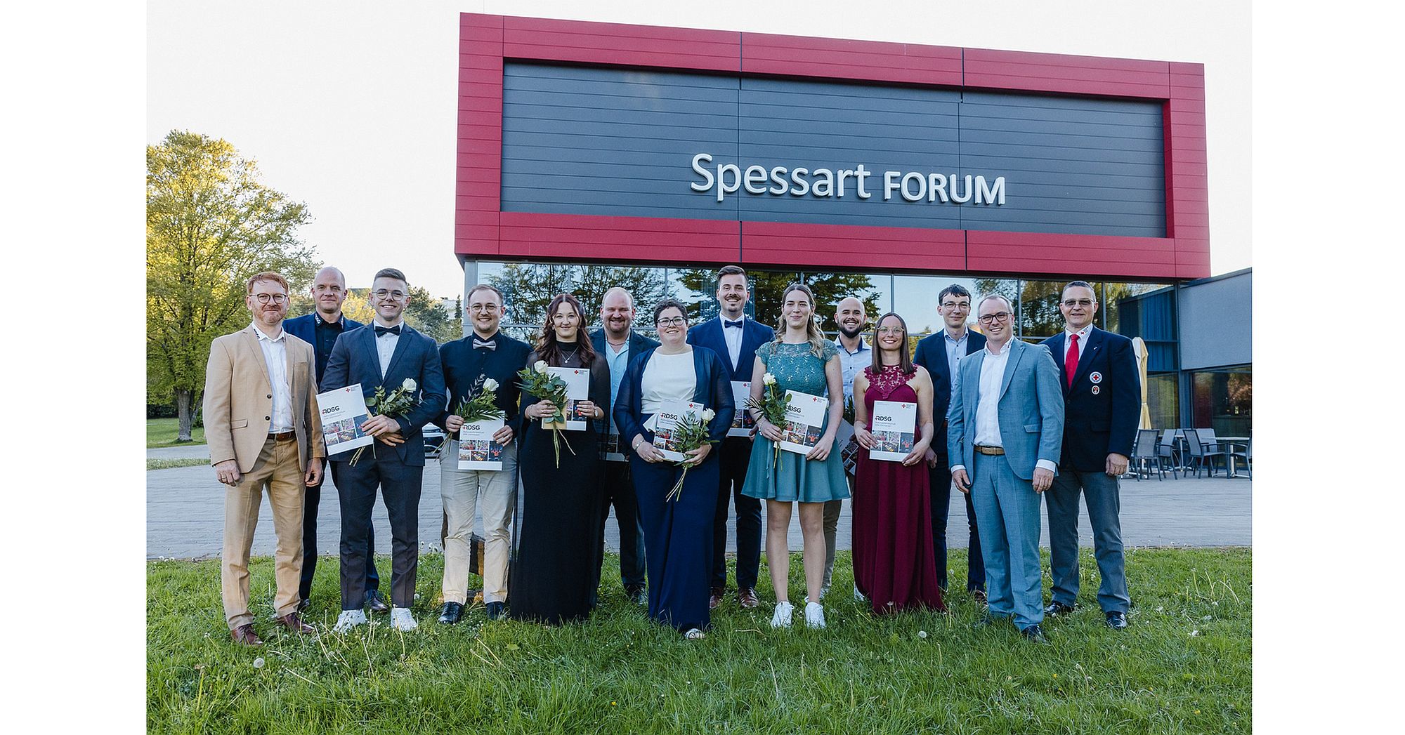 Von links: Werner Herd, stellvertretende Leitung der Rettungsdienstschule Gelnhausen, Klassenlehrer Johannes Rippert, die erfolgreichen Absolventen Clemens Büchse (DRK KV Büdingen), Björn Wilhelmi (DRK KV Gelnhausen-Schlüchtern), Lara Häffner (BF Offenbach), Tobias Röder (DRK KV Gelnhausen-Schlüchtern), Jasmin Brill (DRK KV Büdingen), André Decher (DRK Rettungsdiensts Mittelhessen gGmbH), Jana Müller (DRK KV Gelnhausen-Schlüchtern), David Salathé (DRK KV Büdingen), Alisa Karl (DRK Rettungsdienst Mittelhessen) sowie Fabian Gastine, Mitglied des Vorstands, Michael Dittmar, Leiter der Rettungsdienstschule Gelnhausen und Präsident des Kreisverbandes Christof Hoffmann. Auf dem Foto fehlt Julian Fuß (DRK Fulda).