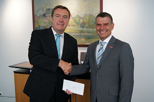 Oberbürgermeister Claus Kaminsky überreichte Kreishandwerksmeister Martin Gutmann im Rathaus einen Scheck im Wert von 12.000 Euro.