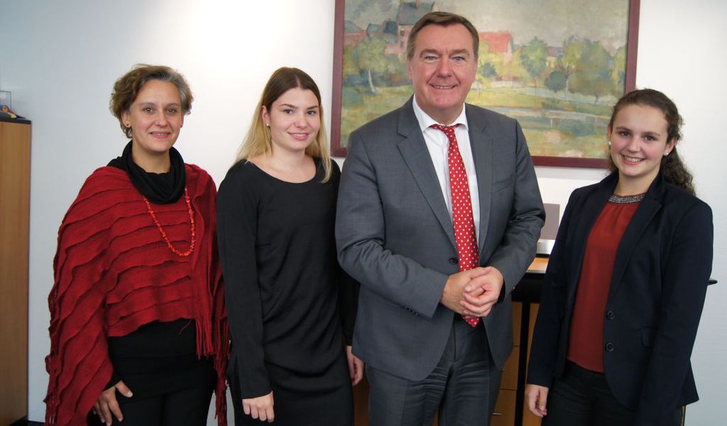 In seinem Amtszimmer im Rathaus begrüßte Oberbürgermeister Claus Kaminsky offiziell zwei junge Frauen, die zum 1. Oktober 2016 ihre Ausbildung bei der Stadt Hanau im Rahmen eines dualen Studiums begonnen haben.