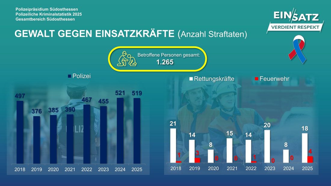 Einsatzkräfte von Polizei, Feuerwehr und Rettungsdienst sorgen tagtäglich für den Schutz und die Sicherheit der Bürgerinnen und Bürger. Die Gesellschaft kann sich stets darauf verlassen, dass den Menschen in Notsituationen schnell geholfen wird. Allerdings kommt es immer wieder zu Angriffen auf Einsatzkräften. Sie werden bedroht, bespuckt, getreten und geschlagen. Im Jahr 2025 wurden im Zuständigkeitsbereich des Polizeipräsidiums Südosthessen 541 Fälle von Gewalt gegen Einsatzkräfte registriert.