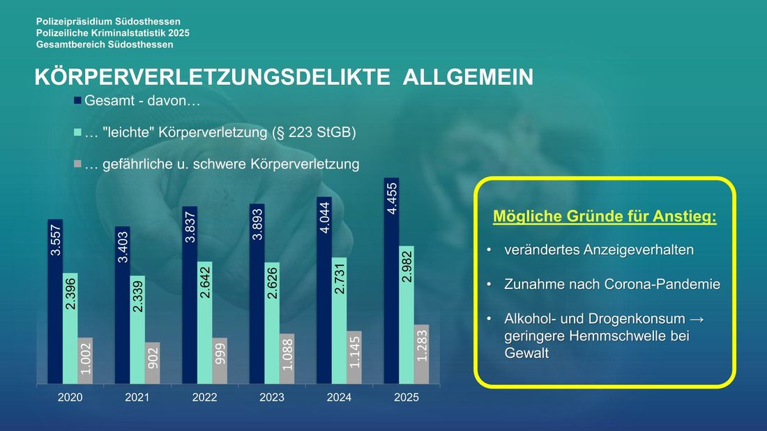 Die Fallzahlen im Bereich der Rohheitsdelikte sind im Jahr 2025 im Zuständigkeitsbereich des Polizeipräsidiums Südosthessen um 11,5 % auf insgesamt 7.382 Fälle gestiegen (+ 762 Fälle). Mit einer Aufklärungsquote von 89,7 % konnten nahezu neun von zehn Straftaten aufgeklärt werden. Der Deliktsbereich Raub und räuberische Erpressung entwickelte sich hingegen rückläufig. Die Zahl der registrierten Fälle sank um 11 Straftaten auf insgesamt 322 Fälle im Jahr 2025 (− 3,3 %).