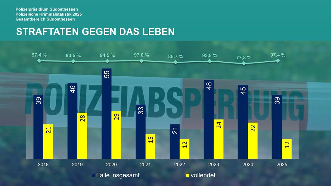 Im Bereich der Straftaten gegen das Leben wurde beim Polizeipräsidium Südosthessen im Vergleich zum Vorjahr ein leichter Rückgang festgestellt. Während im Jahr 2024 noch 45 Fälle registriert wurden, waren es im Jahr 2025 insgesamt 39 Fälle. Hierzu zählen Delikte wie Mord, Totschlag oder Körperverletzung mit Todesfolge.