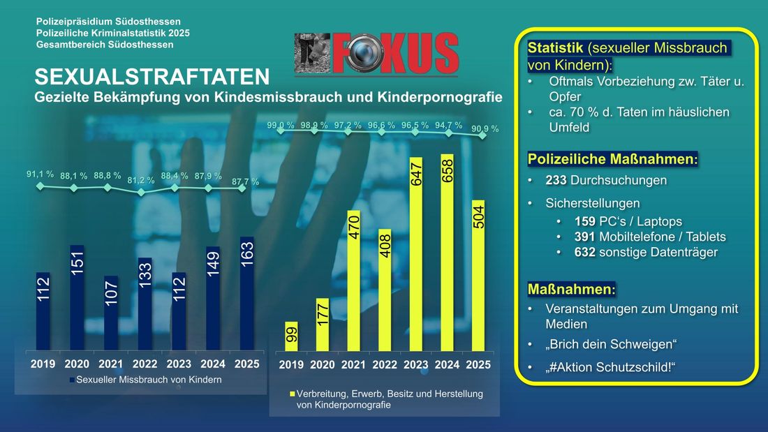 "Die Bekämpfung von Kinderpornografie und sexuellem Missbrauch von Kindern hat weiterhin höchste Priorität", so das Poliziepräsidium Südosthessen zur Kriminalstatistik für das Jahr 2025. Und weiter: "Um Sexualstraftätern habhaft zu werden, werden alle zur Verfügung stehenden Mittel ausgeschöpft. Die Polizei setzt alles daran, Kinder und Jugendliche vor sexualisierter Gewalt zu schützen, anhaltenden Missbrauch zu stoppen und Sexualstraftaten zu verhindern."