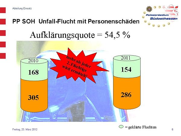 "Bei den Verkehrsunfallfluchten registrierten wir einen Anstieg von 331 Fällen (6,5 Prozent) auf insgesamt 5.399 Delikte. Somit entfernte sich bei deutlich mehr als einem Drittel (38 Prozent) aller aufgenommenen Verkehrsunfälle zumindest ein Beteiligter unerlaubt vom Unfallort, ohne seiner Verpflichtung an der Unfallstelle nachzukommen", sagte der Leitende Polizeidirektor und unterstrich: "Dies ist kein Kavaliersdelikt, sondern eine Straftat!" Deshalb werden sowohl "qualifizierte" Verkehrsunfälle mit Flucht (ab einer Schadenshöhe von 2.000 Euro) als auch Unfallfluchten mit Personenschaden von einer zentralen Unfallfluchtgruppe bearbeitet, die ihren Sitz in Langenselbold hat. Im Jahr 2011 ermittelte das sechsköpfige Team nach 286 Fluchtunfällen, bei denen Personen verletzt wurden, sehr erfolgreich und klärte 154 (54,5 Prozent) auf. Manchmal sind es nur kleine Lacksplitter oder Kunststoffteile, die untersucht werden und die Unfallfahnder letztlich zum Verursacher führen.