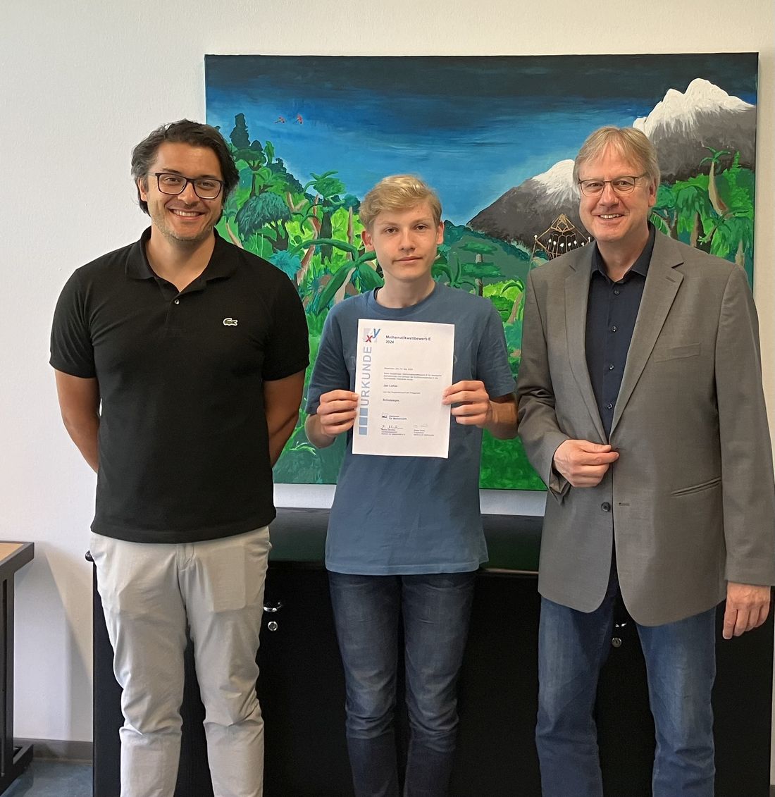 Schulleiter Ulrich Mayer und Mathematiklehrer Daniel Meißner überreichten dem talentierten Schüler seine verdiente Urkunde sowie einen Buchpreis.