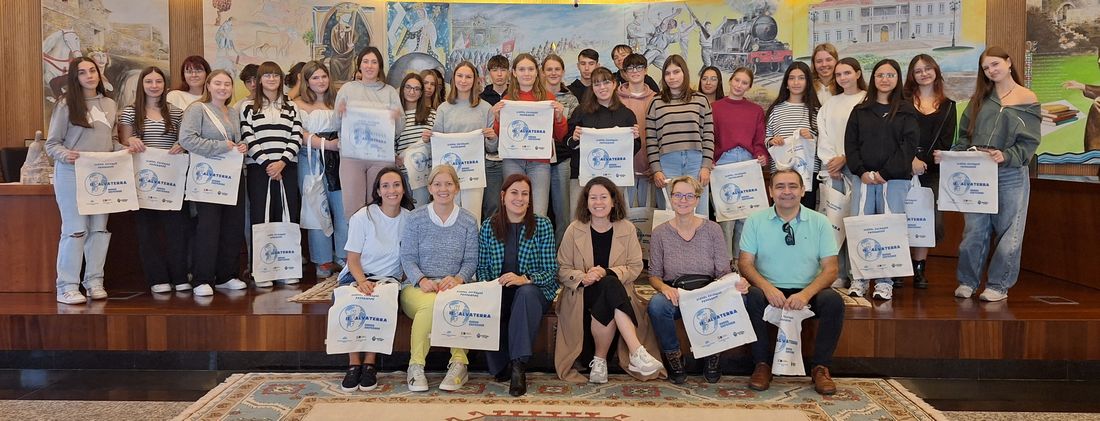 Als nächstes stand der Besuch des Rathauses auf dem Programm. Die Bürgermeisterin hatte eigens für die Austauschteilnehmer eine Fahrt mit dem „Chuchu“, dem Mini-Zug, organisiert. Dieser führte die Gruppe durch die Stadt bis hin zum Rathaus, wo sie von der Bürgermeisterin empfangen und in den imposanten Ratssaal geführt wurden. Die Bürgermeisterin betonte in einer feierlichen Rede die Bedeutung des Schüleraustausches. Gerade der Austausch kultureller Gedanken, wofür Salvaterra als Grenzstadt zu Monção (Portugal) sehr geeignet ist, und das Finden von Gemeinsamkeiten ist ihr zufolge für ein gemeinsames und demokratisches Europa von großer Bedeutung. Als Zeichen der Gastfreundschaft erhielten die Schülerinnen und Schüler eine Stofftasche mit dem gemeinsam erstellten Logo, welches die Partnerschulen repräsentiert.