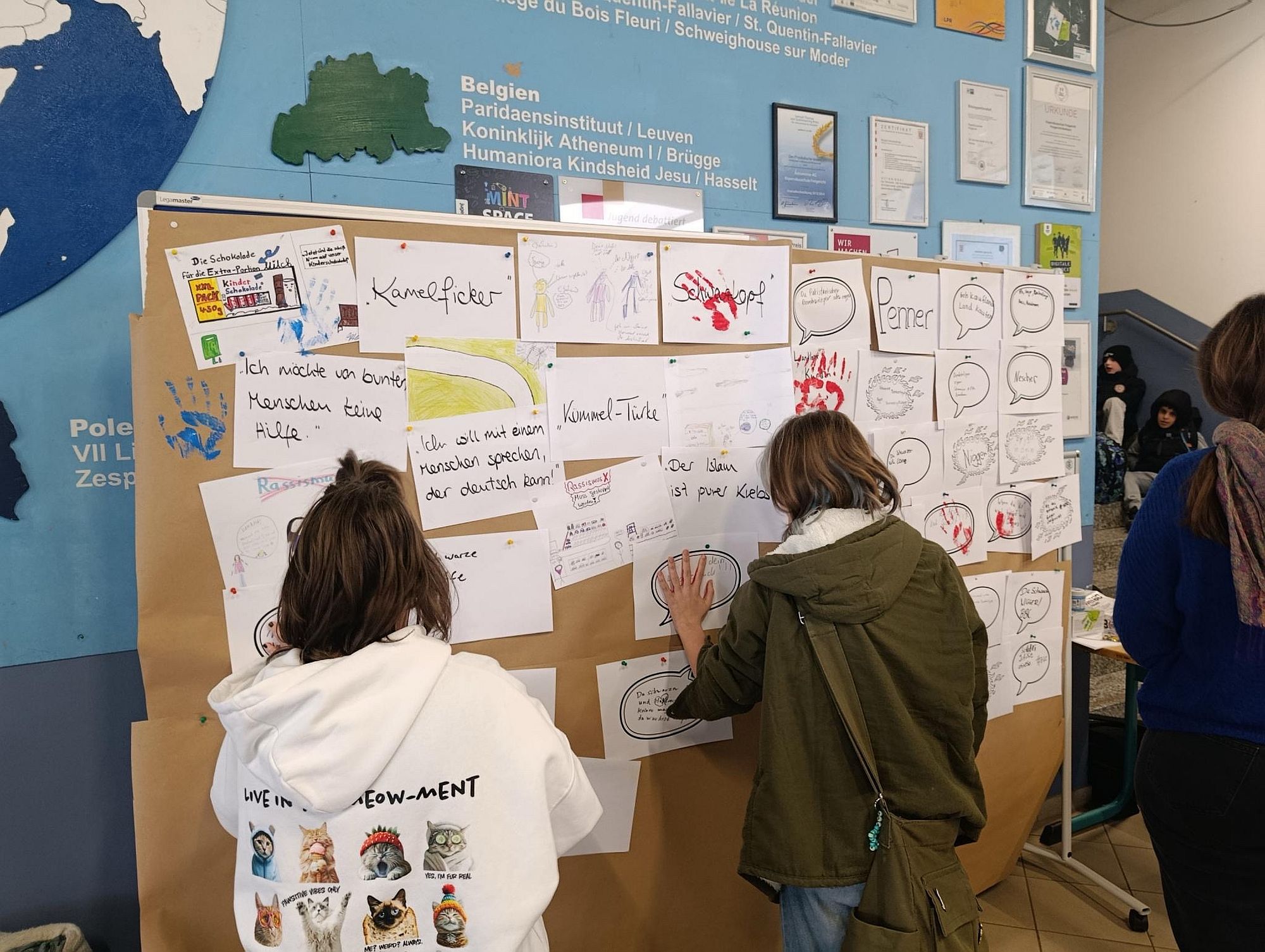 Zwei kreative Mitmachaktionen machten die Haltung der Schule anschließend wortwörtlich sichtbar. Bei der ersten Aktion sprühten Schülerinnen und Schüler positive Botschaften auf den Pausenhof: kurze Sätze, Mutmacher, Zeichen des Zusammenhalts. Der Ort, an dem sonst gelaufen, gespielt und geredet wird, wurde so zur Leinwand für ein gemeinsames Statement: Wir wollen eine Schule, in der jede und jeder dazugehört.