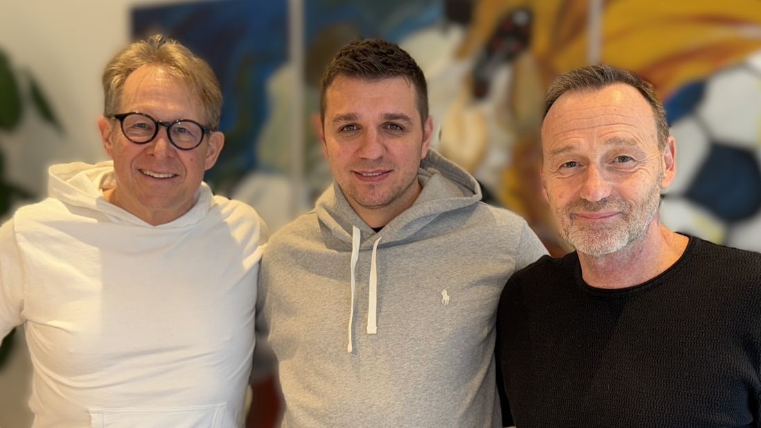 Kreso Ljubicic (Mitte) nach der Vertragsunterschrift in Alzenau zusammen mit Vorstandsmitglied Thomas Schielein (links) und dem Vorsitzenden Andreas Trageser (rechts). Quelle: FC Bayern Alzenau