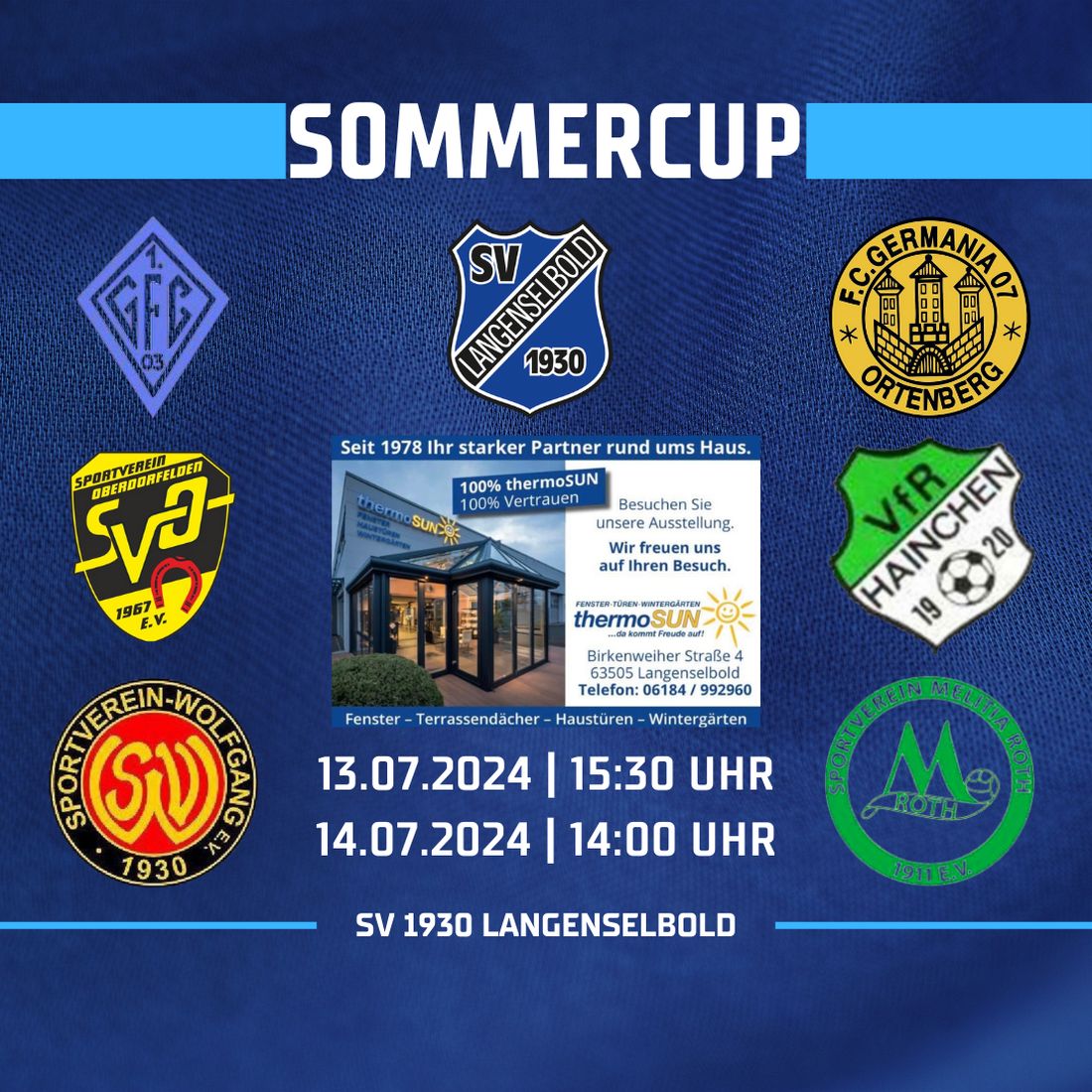 Am 13.7.24 und 14.7.24 findet der 10. thermoSUN Sommercup beim SV 1930 Langenselbold statt.