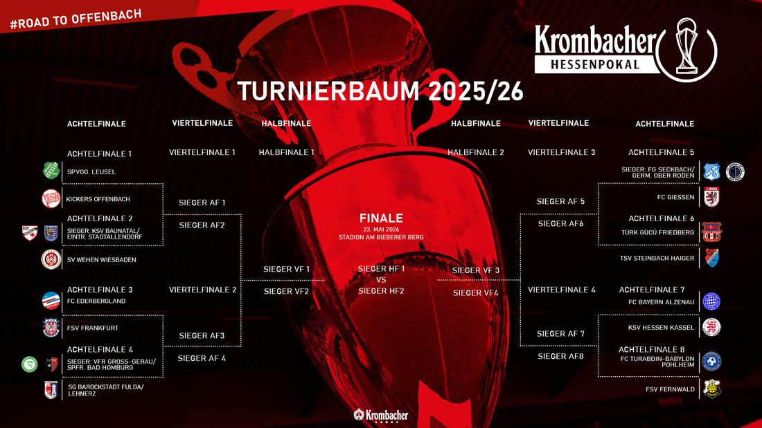 Das Endspiel des Krombacher-Hessenpokalwettbewerbs am 23. Mai 2026 findet im Stadion am Bieberer Berg in Offenbach statt.