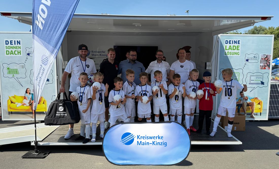 Um 10 Uhr ertönte auf dem Platz in Bernbach der Anpfiff für viele spannende Fußball-Matches. In diesem Jahr nahmen erstmalig auch Jugendteams von außerhalb des Main-Kinzig-Kreises teil. Die neuen Begegnungen waren nicht alltäglich und versprachen schon im Vorfeld außergewöhnliche Spielszenen. Die F-Jugendkicker hatten ihre Spiele nach den FUNino-Regeln ausgetragen, was die Motivation gerade für die Jüngsten nochmals steigerte. In dieser Gruppe waren angetreten: die JSG Freigericht, SG Gründau, S.V. Victoria 1910 Heldenbergen, JSG Sinntal, JSG Florenberg und das Mädchen-Team der SG Schlüchtern. In diesem Turnier stand der Spaß im Vordergrund – es gab nur Gewinner. Am Ende beglückwünschte Bürgermeister Gogel gemeinsam mit Kreiswerke-Geschäftsführer Oliver Habekost die regionalen Fußballhelden und Heldinnen zu ihrer ausgezeichneten spielerischen Leistung. Besonders groß war die Freude, als die Medaillen mit dem Konterfei von Karl Kinzig – dem Maskottchen der Kreiswerke Main-Kinzig – sowie der Turnierball und eine Vereins-Sporttasche an die Nachwuchskicker verteilt wurden.