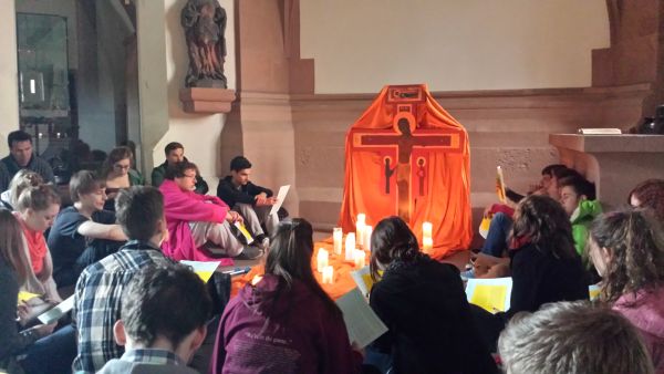 Jugenddiakon Hartmut Winkler führte die Schülerinnen und Schüler zunächst kurz in die Geschichte der Gemeinschaft von Taizé und deren Gottesdienstform ein. Gemeinsam begab sich dann die Gruppe in die Prozessionskapelle der Marienkirche. Dieser kleine, hinter dem Chorraum der Marienkirche gelegene Kirchenraum, war mit vielen Kerzen, die auf orangenen Tüchern um das große Kreuz von Taizé standen, liebevoll hergerichtet. Die Kapelle bot mit ihren gotischen Spitzbögen, den alten Fenstern und Heiligenfiguren eine besondere Atmosphäre und ein Gefühl der Geborgenheit. Gemeinsam sang man die für Taizé typischen Gesänge, oft auch mehrstimmig. Lesungen und Fürbitten in verschiedenen Sprachen trugen die Schülerinnen und Schülern vor und es gab auch eine Zeit des Schweigens.