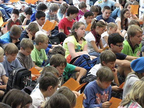 Man fühlte sich fast auf eine Baustelle an der Autobahn versetzt, als sich am Vormittag des 14. August ca. 400 Schüler und Schülerinnen aller Klassen mit einigen Eltern und Lehrern zum traditionellen Schulanfangsgottesdienst in der Aula des Grimmelshausen Gymnasiums versammelten.