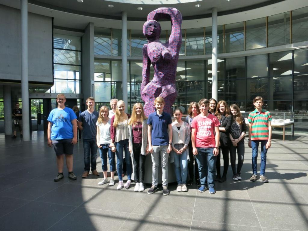 Weil neben dieser ganzen Arbeit aber auch Gemeinschaftssinn, Freude und schulisches Lernen nicht zu kurz kommen sollen, unternimmt das Helferteam einmal im Jahr einen Ausflug, der stets etwas mit den Themen „Bücher“ oder „Bibliothekswesen“ zu tun hat. In diesem Jahr war die Deutsche Nationalbibliothek in Frankfurt das Ziel der LMF-Gruppe. Dort angekommen, erwartete die Schüler und die begleitenden Lehrer Thomas Kleer und Dr. Sebastian Haude eine fachkundige Führung durch die weitläufigen Räumlichkeiten der Bibliothek. Im Rahmen dieser Führung lernte die Gruppe vor allem die Geschichte, den Aufbau und die Benutzung des Frankfurter Standortes genauer kennen.