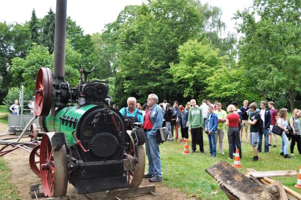 Die Schüler fuhren vom Eisernen Steg mit dem historischen Zug der Museumseisenbahn Hanau zum Bahnhof Großauheim, wo sie vom Team der Städtischen Museen Hanau, unterstützt von Sarah Katzlinger, Mitarbeiterin der Kathinka Platzhoff Stiftung, in Empfang genommen wurden. Im Anschluss wurden die Schüler von der Leiterin des Museums Großauheim, Beate Hofmann, und ihren Mitarbeiterinnen durch das Museum und über das neue Technikparkgelände des Fördervereins Dampfmaschinenmuseum geführt. Hier konnten sie als Highlight ihres Aufenthaltes eine Dampfmaschine mit Wasserpumpe erleben, die vom Vorsitzenden des Fördervereins Hans Werner Dörich und seinen Mitgliedern in Betrieb genommen wurde.