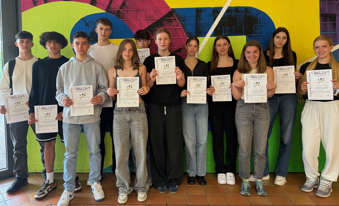 Bei den etwas älteren Mädchen der Jahrgansstufen 9-11 erreichte das HOLA-Team ebenfalls den 3. Platz im Landesentscheid dank Alma Bartkuhn, Amelie Quast, Jana Mayrhofer und Leonie Jung (alle Klasse 10B), Charlin Streitz (10G), Taina Wisniewski (9B) und Rachel Maisels (Jg. 11).