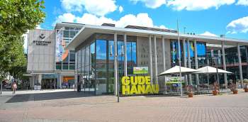 Das Gebäude des Service- und Ticket-Center am Marktplatz. Für fünf Monate zieht dort ein Pop Up-Eiscafe ein. Im Winter beginnen die Bauarbeiten für den externen Zugang zur kommenden Decathlon-Filiale im Untergeschoss des Stadthof Hanau. Quelle: Stadt Hanau / Moritz Göbel