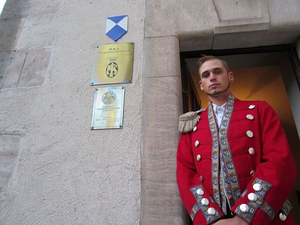 Der stellvertretende Vorsitzende Pascal Schäfer verkleidet sich während der Schlossführung als „Butler“ und bringt die Gäste damit zum Staunen. Die Uniform des „Schlossdieners“ ist ein Originalstück mit dem Kühlmann'schen Wappen aus der Anfangsphase des Schlosses.