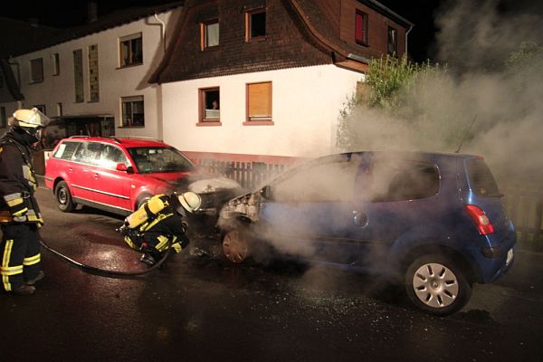 Anwohner bemerkten den Brandrauch in der Nacht zum Dienstag und alarmierten umgehend die Feuerwehr unter dem Notruf 112. Um 3.09 Uhr wurde die Feuerwehr Salmünster alarmiert. Bei Eintreffen der Feuerwehr stand ein Pkw (Renault Twingo) in Vollbrand, der Brand war von der Pkw-Vorderseite bereits auf den Motorraum eines weiteren Pkws (VW Passat) übergegriffen. Unter Atemschutz löschte ein Trupp sofort beide Fahrzeuge ab, so dass nach wenigen Minuten „Feuer aus“ gemeldet werden konnte. Ein hölzerner Gartenzaun wurde beim Brand ebenfalls angekokelt, ein weiteres Ausbreiten konnte unterbunden werden. Die Einsatzstelle wurde ausgeleuchtet und Nachlöscharbeiten im Motorraum durchgeführt. Der Einsatz war um etwa 4 Uhr beendet.