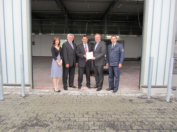 Regierungspräsident Johannes Baron hat im Feuerwehrhaus in Hammersbach Bürgermeister Michael Göllner einen entsprechenden Bewilligungsbescheid übergeben.