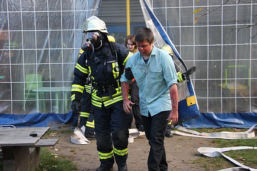 Insgesamt waren 44 Rettungskräfte (30 von der Feuerwehr, 14 vom Roten Kreuz) im Einsatz. Mit dabei war auch die Mimentruppe des Roten Kreuz , die realistisch geschminkt 4 Verletzte stellte.