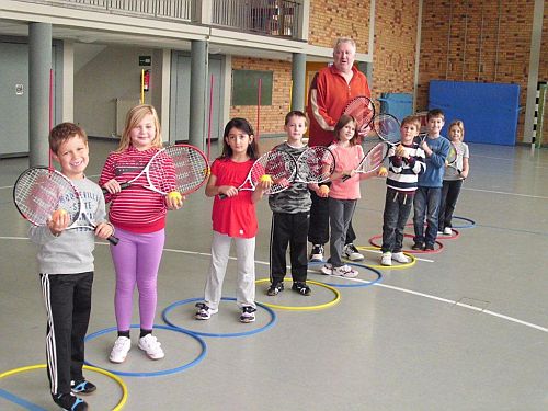 Gut zehn Kinder treffen sich jeden Freitag nach Schulschluss in der Turnhalle und nehmen begeistert am Training mit Tennislehrer Jürgen Lehmann teil. "Geschicklichkeits- und Bewegungsspiele gehören genauso, wie Koordination und Umgang mit verschiedenen Tennisbällen zum Übungsplan. Bei einigen Kindern ist bereits heute erkennbar, dass sie sehr schnell das Tennisspiel, das garnicht so einfach ist, erlernen", sagt Jürgen Lehmann, der nach den Wintermonaten gerne das Angebot des Vereins wahrnehmen will, auf der Außenanlage am Wingertsweg das Projekt fortzuführen.