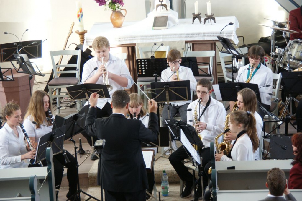 Darauf folgte die einzigartige Titelmelodie im 5/4 Takt "Mission impossible". Unter der Leitung von Landesmusikdirektor Karsten Meier brillierten die jungen Musiker auch mit dem letzten Stück "Disney Film Favorites". Danach begannen die 31 Mitglieder des Stammorchsters ihre musikalische Reise durch unterschiedlichste Zeiten und Kontinente in den schottischen Highlands mit "A Highland Rhapsody. Dieses Stück, bedienst sich der schottischen Volksmusik. Durch unterschiedliche Stilelemente gelingt es dem Komponisten van der Roost die Atmosphäre eines feucht fröhlichen, leicht melancholischen Highlandfestes zu zaubern. Weiter ging es nach Amerika mit "Shenandoah", und Frankreich ins 17. Jahrhundert mit "Der Mann mit der eisernen Maske". Mit den "Sea Songs" begab sich das Orchester mitten ins britische Empire Anfang des 20. Jahrhunderts, bevor es ins antike Griechenland reiste und "Medusa" die Schlangengöttin, aus 1400 v. Chr. traf. Florian Fillsack am Flügelhorn übernahm als Solist den Sprung über den Ozean zu einem Tango nach Argentinien mit "Oblivion". Besondere Fingerfertigkeiten benötigte das Orchester für den Zwischenstopp mit "Palladio", komponiert als Werbespot für Diamanten. Passend zum Thema beschloss der Musikverein seine Reise mit "Voyage into the blue", der bildhaften Musik, die die Reise eines Flugzeugs beschreibt. Zum Schluss bedankte sich die Vorsitzende, Nadja Erbe, für die von Orchester und Dirigent geleistete Arbeit und bei der Kirchengemeinde Spielberg, die sich bereit erklärt hatten, Publikum und Orchester zu verpflegen. Das Publikum belohnte Jugend- und Stammorchester mit lang anhaltendem Applaus und lies die Musiker nicht ohne Zugabe gehen.