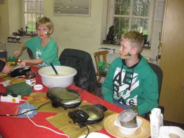 Für das leibliche Wohl war ebenfalls bestens gesorgt. Die Frauen des Hauswirtschaftsbereichs boten in gemütlicher Atmosphäre eine Vielzahl von leckeren Torten und Kuchen an. Ein Crêpes mit Nutella oder Puderzucker gab es bei Gruppe Turin und wer noch nie Apfelwaffeln probiert hatte, konnte dies bei Gruppe Savio tun. Bei den Metallern brutzelte Sven Krack Gyros in der offenen Pfanne, was so gut schmeckte, das Nachschub geholt werden musste. Vor dem Bratwurststand der Farbwerkstatt kamen Bernd Heil und Marcel Jäger trotz kalter Temperaturen ins Schwitzen, da sich lange Schlangen bildeten. Erstmals gab es mit der Kartoffel-Kürbis-Suppe auf Wunsch einer Mutter ein Angebot für Vegetarier. „Nächstes Jahr mache ich das wieder und noch mehr,“ freut sie sich, denn auch die Fleischesser griffen gerne zu. Ein Heißgetränk tat gut bei den kalten Temperaturen, da fiel eher die Auswahl zwischen Apfel- oder Orangensaft oder dem roten Kinderpunsch schwer. Den für den Weihnachtsmarkt obligatorischen Glühweinausschank hatte das Wohnhaus-Team mit den volljährigen Jugendlichen übernommen.