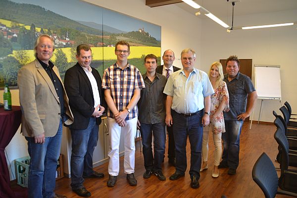 Foto: Tobias Grünewald, Daniel Grießmann, Lehrer Hr. Kohl, Bürgermeister Andreas Hofmann, Gewerbevereinsvorsitzender Dirk Specht und Michelle Bossert, IHK-Referent Martin Vosseler wollen Vermarktungschancen auftun.