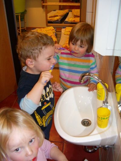 Ja, auch im Krippenalter kann man sich bereits mit dieser Thematik befassen. Dieses Projekt wurde über mehrere Wochen durchgeführt und hatte die Ritualisierung des Zähneputzens, das Selbstverständnis für Mundhygiene als Ziel. Das Zahnputzlied, Bilderbücher und sogar ein Kinderzahnarztstuhl waren dabei wichtige Helfer, um den Kindern die Möglichkeit zu geben, sich mit der Thematik zu verbinden.