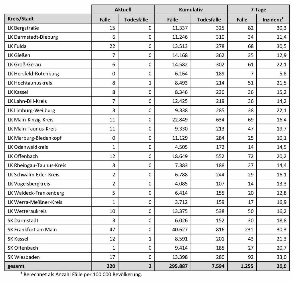 Die Zahl der nachgewiesenen Fälle von Corona-Infektionen im Wetteraukreis liegt am Freitag (6. August) bei 13.375 (Stand RKI O.OO Uhr), zehn mehr als am Donnerstag gemeldet. Die Inzidenz, die Zahl der Neuinfektionen pro 100.000 Einwohner binnen sieben Tagen liegt laut RKI bei 16,2. Die Neuinfektionen wurden aus Bad Nauheim (2), Bad Vilbel (4), Büdingen (-1), Hirzenhain (2), Karben (2) und Ortenberg (1) gemeldet.