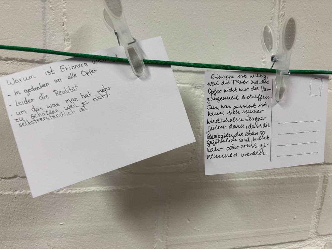 Zum Abschluss gestalteten die Jugendlichen Postkarten zur Frage, warum das Erinnern an die Verbrechen der Nationalsozialisten so wichtig ist. Die Veranstaltung machte deutlich: Erinnerung bedeutet nicht nur, an Leid zu erinnern – sondern auch, Verantwortung für Gegenwart und Zukunft zu übernehmen.