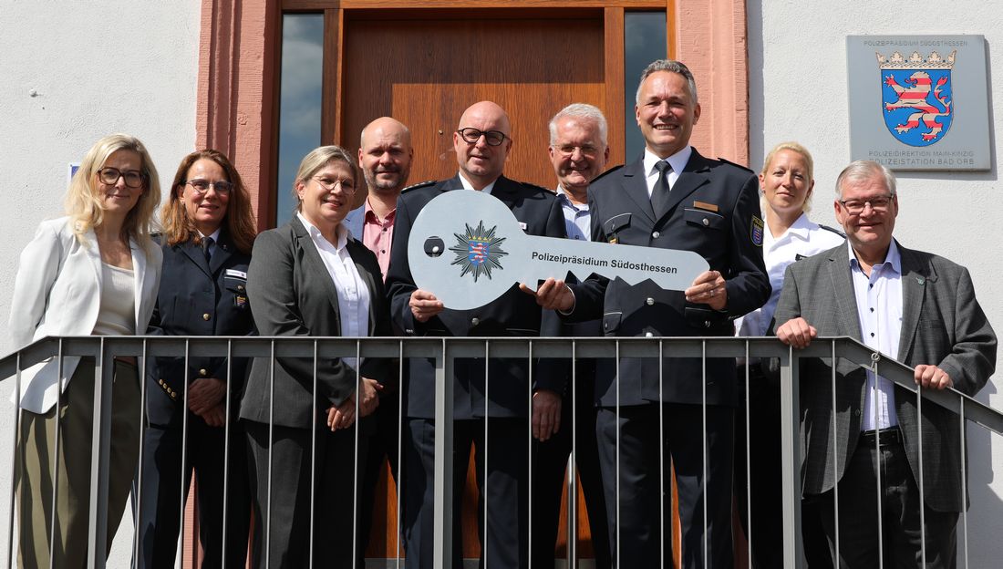 Symbolische Schlüsselübergabe zwischen dem ehemaligen und dem neuen Dienststellenleiter der Polizeistation Bad Orb (von links): Bürgermeisterin Sibylle Hergert, Leiterin des Abteilungsstabs Claudia Rogalski, Polizeivizepräsidentin Anja Wetz, Bürgermeister Victor Röder, Erster Polizeihauptkommissar Axel Pauli, Bürgermeister Andreas Weiher, Erster Kriminalhauptkommissar Franz Josef Hiery, Bad Orbs zukünftige Schutzfrau vor Ort Polizeioberkommissarin Susen Pradel und Bürgermeister Tobias Weisbecker. Quelle: PP Südosthessen