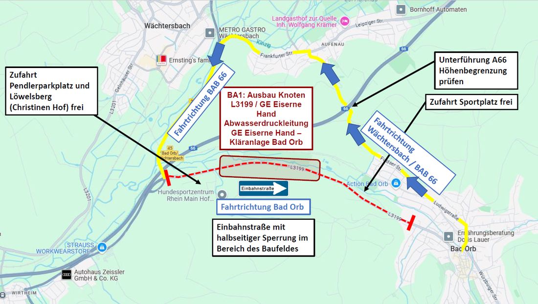 Die Stadt Bad Orb teilt mit, dass ab dem 6. August 2025 die Baumaßnahmen zur Anbindung des neuen Gewerbegebiets „Eiserne Hand“ (Hydropark) an die L 3199 beginnen. Die Arbeiten finden im Bereich zwischen der Autobahnausfahrt Bad Orb / Wächtersbach und dem Stadtgebiet statt. Die Arbeiten zur Errichtung der neuen, mit Lichtsignalanlage versehenen Abzweigung sollen bis Weihnachten 2025 abgeschlossen sein.