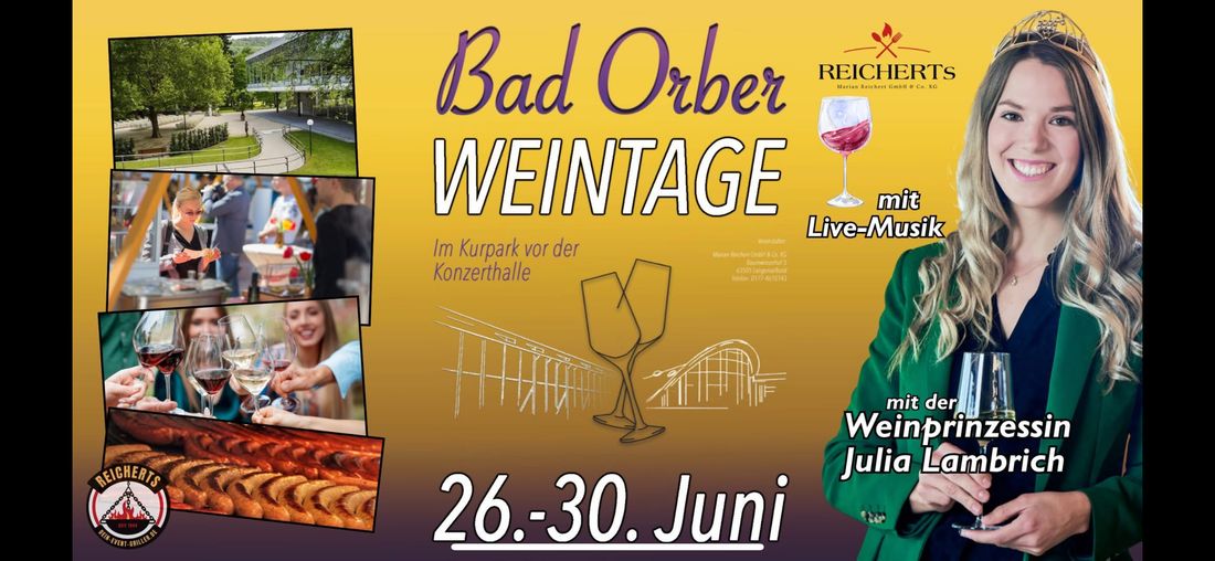 Der Kurpark vor der Konzerthalle Bad Orb wird in diesem Jahr zum Treffpunkt für Weinliebhaber, Feinschmecker und Musikfreunde: Vom 26. bis 30. Juni finden die ersten Bad Orber Weintage statt – ein Fest, das Genuss, Geselligkeit und musikalische Highlights in einzigartiger Atmosphäre vereint. Der Eintritt ist an allen Tagen frei.