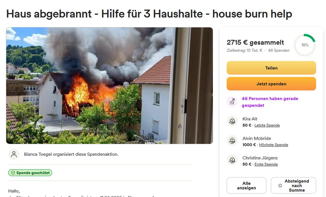 "Das Elternhaus meiner besten Freundin ist am 11.05.2025 in Flammen aufgegangen. Darin wohnen Ihre Tochter mit Ehemann, ihr Sohn mit Freundin und der Vater. Eines der schlimmsten Dinge, die einem passieren können, plötzlich alles zu verlieren. Ich würde so gerne helfen, aber alleine reicht meine Hilfe nicht aus. Deswegen bitte ich um eure Hilfe auf diesem Weg. Jede Spende hilft, sei sie auch noch so klein“, heißt es auf dem GoFundMe-Spendenaufruf, den Bianca Tögel nun ins Leben rief.