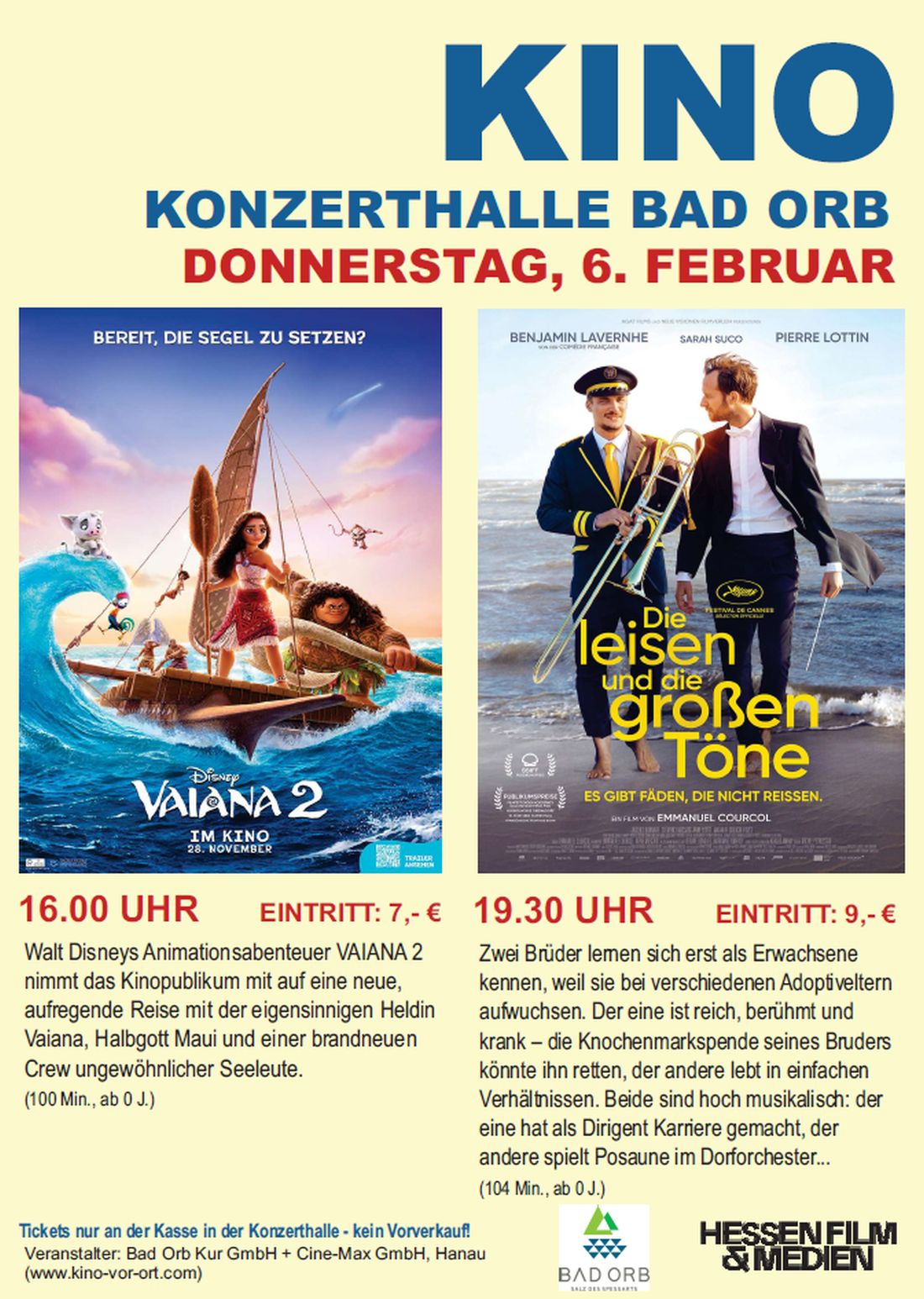 Filmfreunde dürfen sich freuen: Am Donnerstag, 6. Februar 2025 verwandelt sich die Bad Orber Konzerthalle wieder in einen Kinosaal und präsentiert zwei herausragende Filme für Groß und Klein.