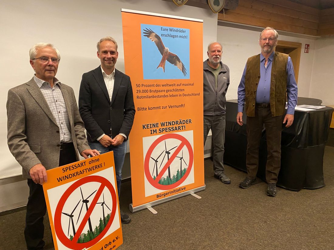 Von links: Heinz Josef Prehler, Vorsitzender Gegenwind Bad Orb; Steffen Kempa, Geschäftsführer Bad Orb Kur GmbH; Dr. Berthold Andres, Vorsitzender Windkraft im Spessart – In Einklang mit Mensch und Natur; Günter Hunold, Förster i. R..