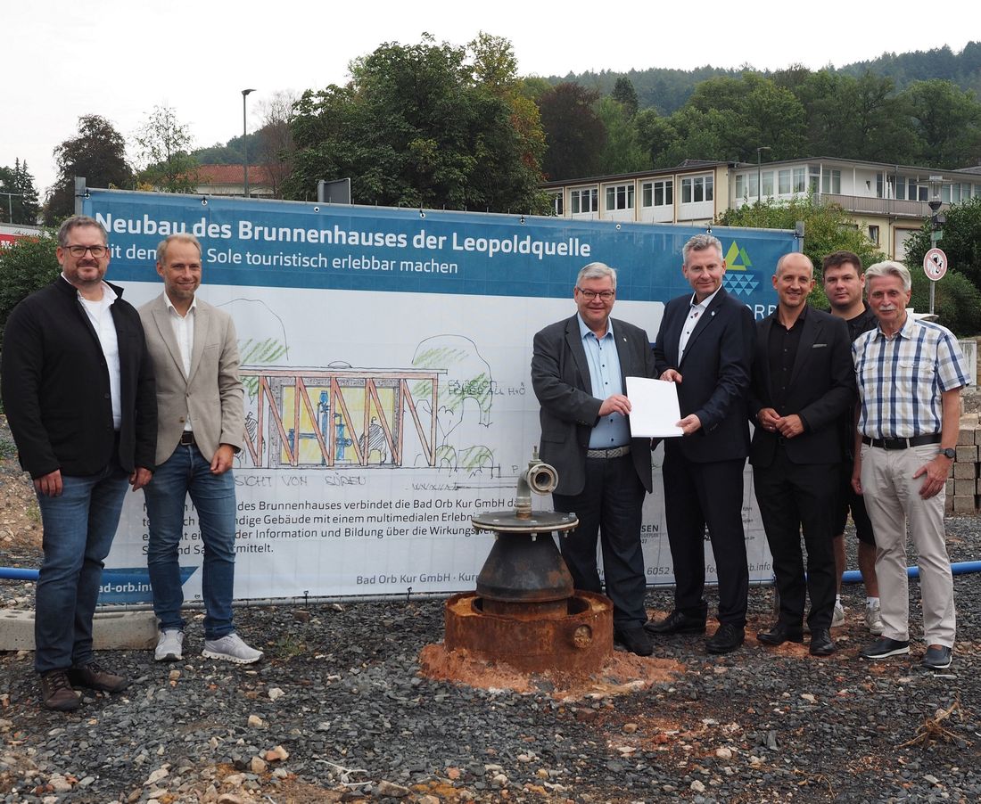 Erster Kreisbeigeordneter Andreas Hofmann (Mitte) überreichte Bad Orbs Bürgermeister Tobias Weisbecker (Dritter von links) den Förderbescheid für den Neubau des Brunnenhauses an der Leopoldquelle. Neben Dominik Brasch (Dritter von rechts) und Thomas Dickert (rechts) vom Verband SPESSARTregional e.V. nahmen auch Steffen Kampa und Christopher Blos, Bad Orb Kur GmbH, und Johannes Michel, Leiter der Abteilung Entwicklung ländlicher Raum im Amt für Umwelt, Naturschutz und ländlicher Raum des Main-Kinzig-Kreises, teil.