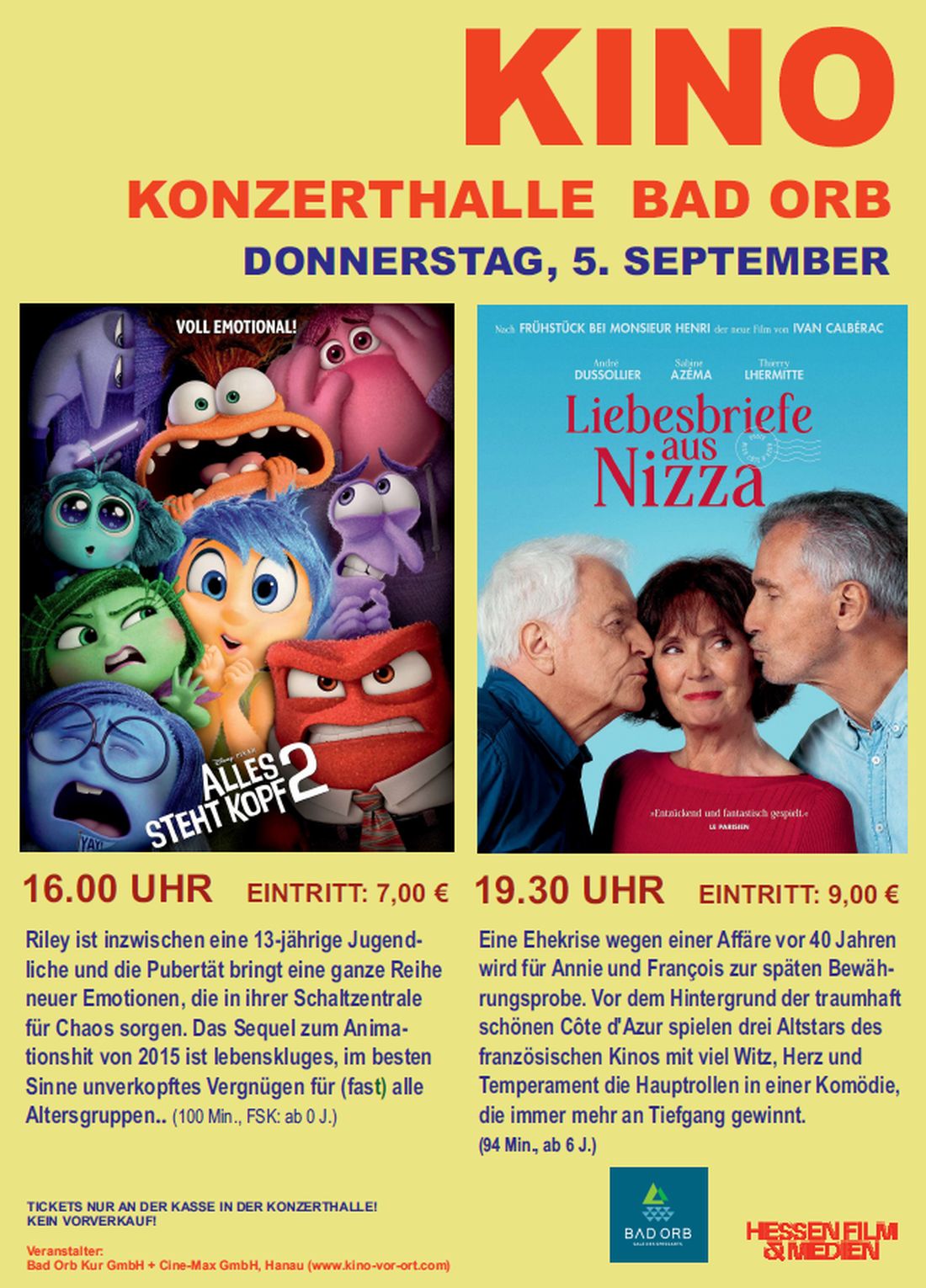 „Alles steht Kopf 2“ und „Liebesbriefe aus Nizza“ im Kino Bad Orb
