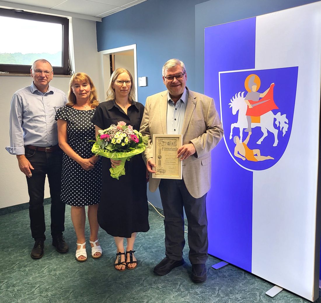 25-jähriges Dienstjubiläum im Kreise der Gratulanten (von links): Manfred Walter, Sabine Mühl, Jubilarin Sabrina Schäfer, Bürgermeister Tobias Weisbecker.