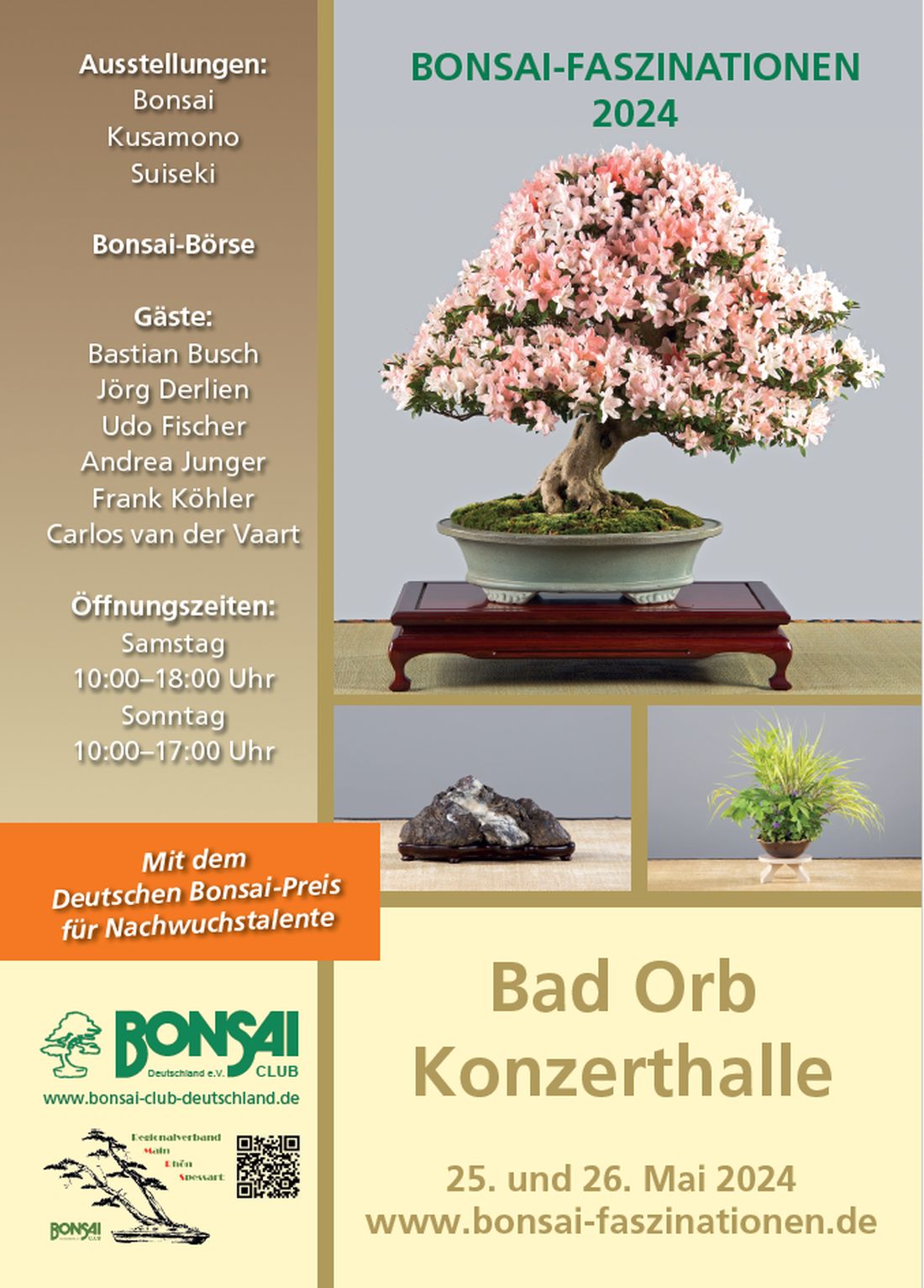 Die jährlich stattfindende Bundesausstellung des Gesamtverbandes Bonsai-Club-Deutschland e.V. findet am 25. und 26.Mai 2024 in Bad Orb statt. Für dieses Großevent unter der Schirmherrschaft von Landrat Thorsten Stolz (SPD) wird die Konzerthalle Bad Orb genutzt. Es werden bei der Ausstellung circa 1.000 Gäste über die zwei Veranstaltungstage aus ganz Deutschland erwartet. Die Ausstellung ist für Jedermann geöffnet und wird erfahrungsgemäß neben Fachbesuchern auch sehr viele allgemein interessierte Personen und Zufallsbesucher anziehen.