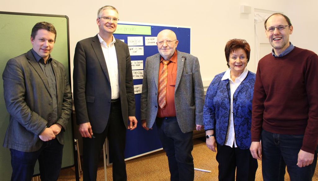 Foto: Klausurtagung zum Thema Wirtschaftsfaktor Gesundheitstourismus (von links): Georg Freund, Geschäftsführer der Reha-Klinik Küppelsmühle, Referent Detlef Jarosch, Bürgermeister Roland Weiß, Professor Dr. Ursula Funke und der Allgemeinmediziner und Badearzt Michael Stock.